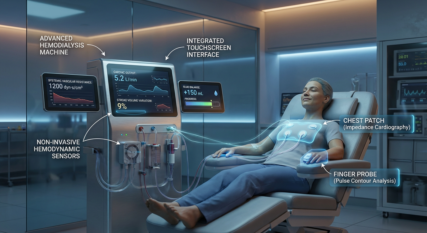 Hemodialysis (HD) therapy, while life-sustaining for patients with end-stage renal disease (ESRD), invariably imposes significant physiological challenges, particularly on the cardiovascular system. The dynamic nature of extracorporeal blood purification, coupled with the inherent cardiovascular vulnerabilities of this patient population, results in a complex interplay of stressors that contribute to a heightened risk of morbidity and mortality. Noninvasive hemodynamic monitoring is paramount for HD patients due to the considerable stress placed on the heart and peripheral vasculature 1 2 .