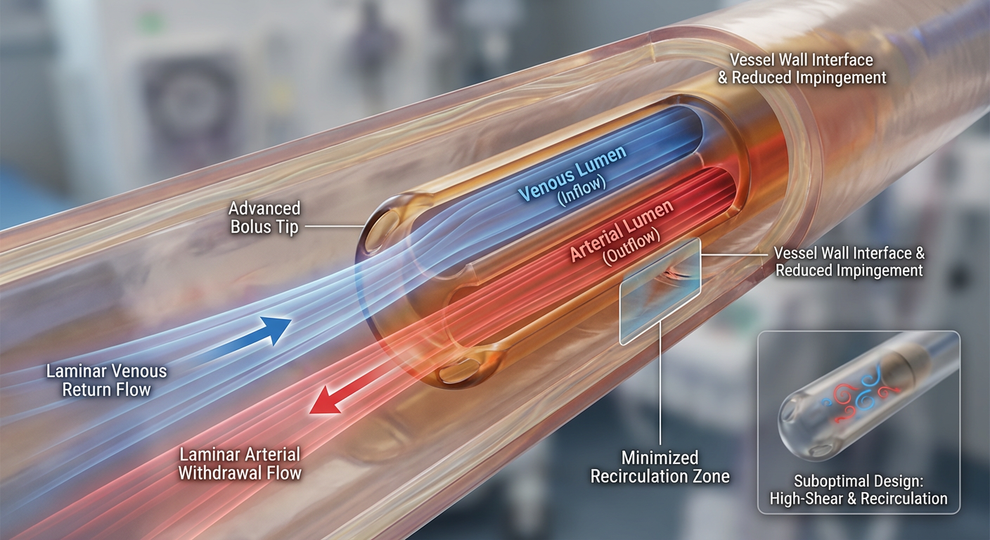 Dual-lumen catheters, commonly employed in hemodialysis, simultaneously accommodate opposing blood flow, with one lumen for arterial outflow and the other for venous return 92 . The geometric configuration of the catheter tip, particularly its "bolus tip design," is critical in dictating the localized flow patterns and, consequently, the shear stress exerted on the vessel wall.