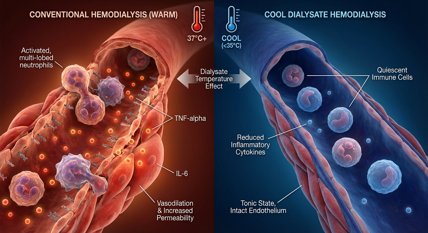 Conventional hemodialysis is associated with a degree of biocompatibility stress, leading to chronic microinflammation. Hypothermic conditions, achieved through cool dialysate hemodialysis, have been shown to directly suppress the activation of neutrophils and monocytes 40 . The precise mechanisms involve reduced release of inflammatory mediators and preservation of endothelial function, which collectively contribute to better vasomotor control and stability.