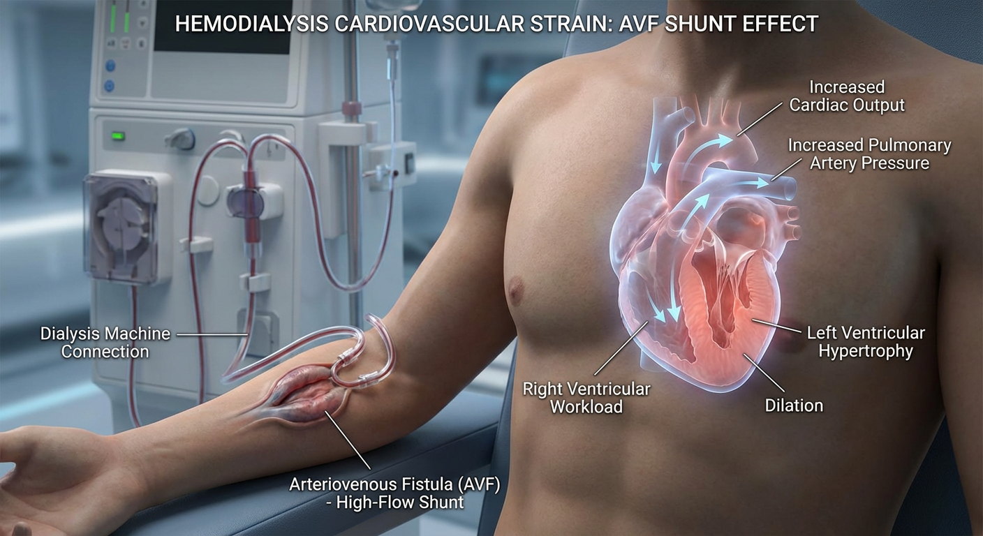 The creation of an arteriovenous fistula (AVF) or arteriovenous graft (AVG) for vascular access, while crucial for efficient HD, introduces a chronic hemodynamic burden that significantly affects cardiac function 6 7 .