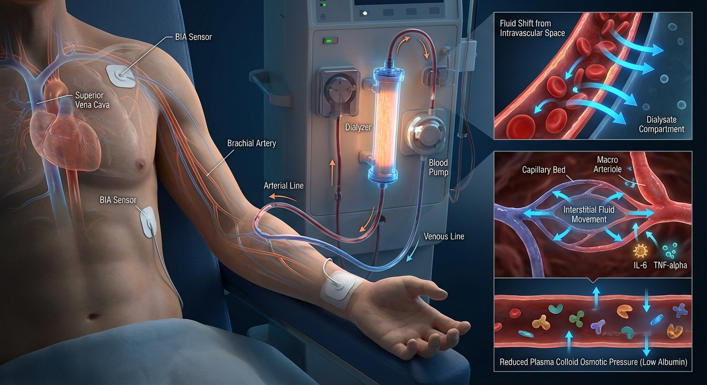 Low plasma albumin levels, frequently observed in malnourished or inflamed ESRD patients, significantly diminish plasma colloid osmotic pressure 51d. This reduction impedes the movement of interstitial fluid back into the intravascular compartment, thereby lowering effective circulating blood volume and exacerbating the susceptibility to hypotension during fluid removal. Concomitantly, decreased plasma colloid osmotic pressure can aggravate tissue edema, further compromising systemic vascular stability 54 .